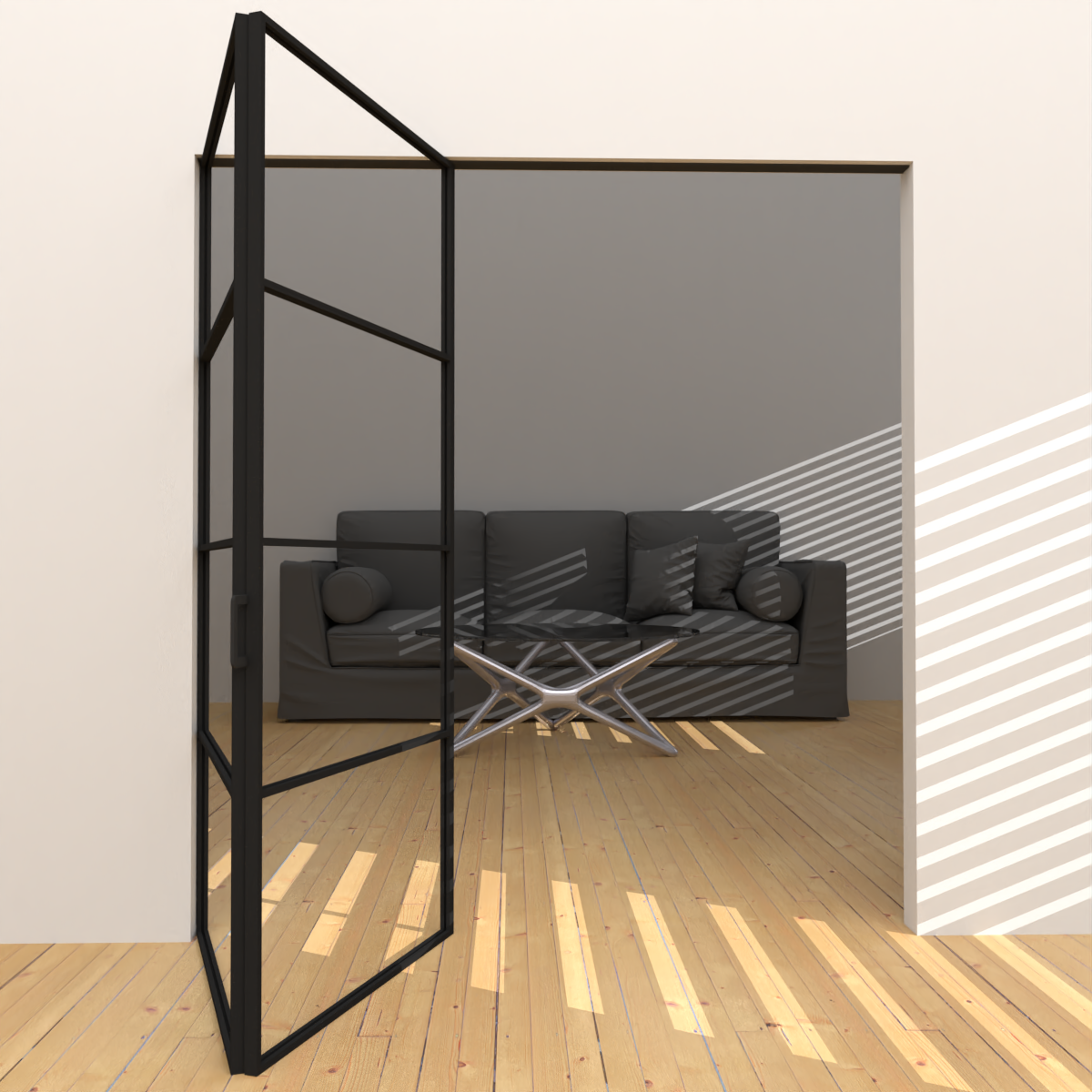 Our industrial folding doors combine the utility of aluminium with the recognised appearance of steel doors. Steel can be replaced with lightweight, more affordable powder-coated aluminium profiles, and glazing bars on the glass panels serve to complete the modern, industrial look.